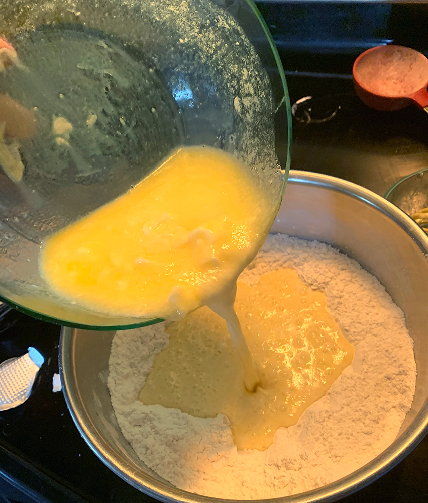 - In a separate bowl, whisk beaten eggs, buttermilk, butter and vanilla. Add wet ingredients to dry ingredients, and stir until just mixed (don’t over stir, or they will get tough.)