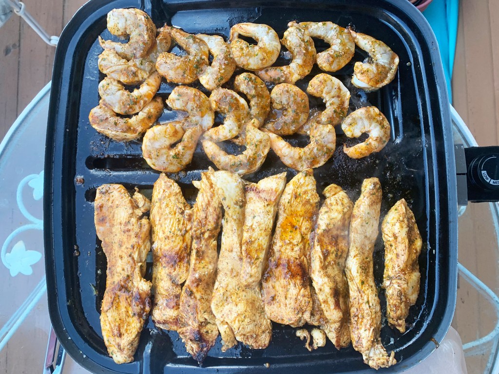 My chicken was in thin slices, and my shrimp were rather large, so they all cooked in about the same time. Make sure your shrimp are pinkish, no longer translucent, and your chicken is cooked through. Be careful not to overcook either one. And bonus points for the nice char marks you get from your grill.