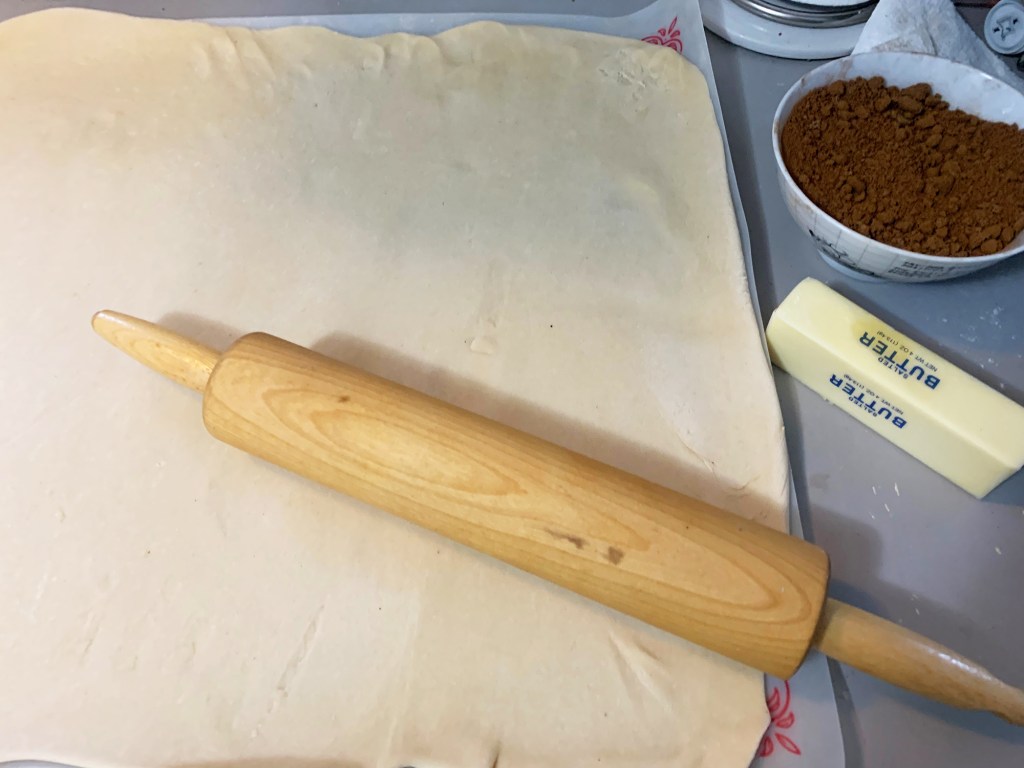 - Roll the dough into a 18 x 21 inch rectangle. Spread 1/3 cup butter onto the dough and top with the brown sugar and cinnamon mixture.