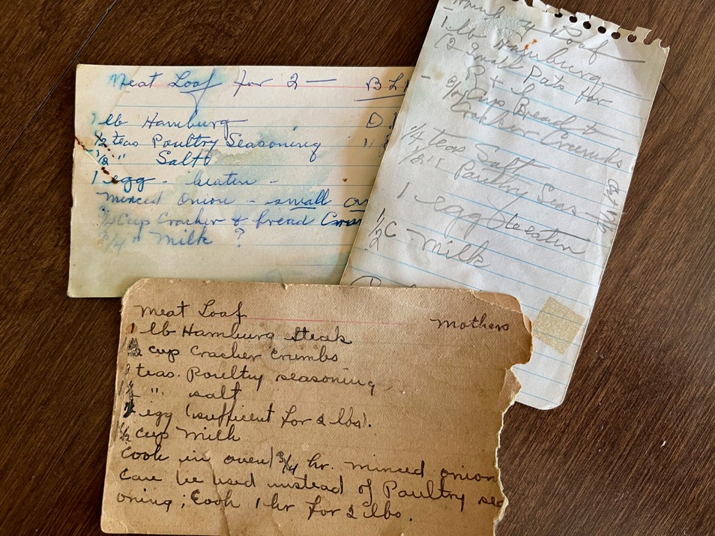 When I was going through my Grandma Barbara’s recipes last weekend, I came across her recipe for Meatloaf and I thought “why not. Let’s give it a try.” There were actually 3 separate recipes that she had: Meat Loaf – Mother’s, Meat Loaf for 2 – BLH (Barbara Lincoln Holbrook – my grandmother), and Hamburg Loaf.
